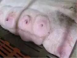當(dāng)夏季環(huán)境溫度較高時(shí),母豬體內(nèi)溫度較高,血液主要供給皮膚毛細(xì)血管進(jìn)行散熱,而進(jìn)入乳房的血流量減少,營養(yǎng)供給減少,從而導(dǎo)致產(chǎn)奶量降低。產(chǎn)奶量降低表現(xiàn)為:母豬乳房周圍有明顯的黑圈,仔豬額頭有黑色污漬。如下圖