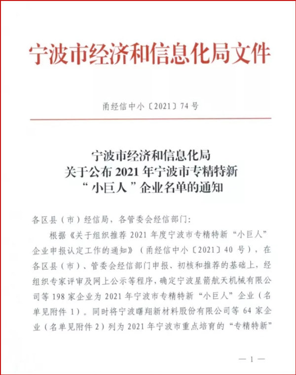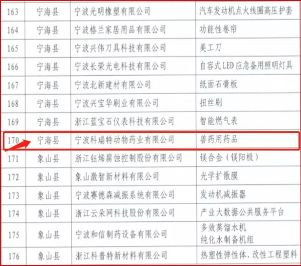 近日,根據(jù)《關于組織推薦2021年度寧波市專精特新“小巨人”企業(yè)申報認定工作的通知》(甬經信中小〔2021〕40號)在各區(qū)縣(市)、管委會經信部門申報、初核和推薦的基礎上,經組織專家評審及網上公示等程序,寧波市經濟和信息化局公布《2021年寧波市專精特新“小巨人”企業(yè)名單的通知》,熱烈祝賀寧波科瑞特動物藥業(yè)有限公司榮幸入