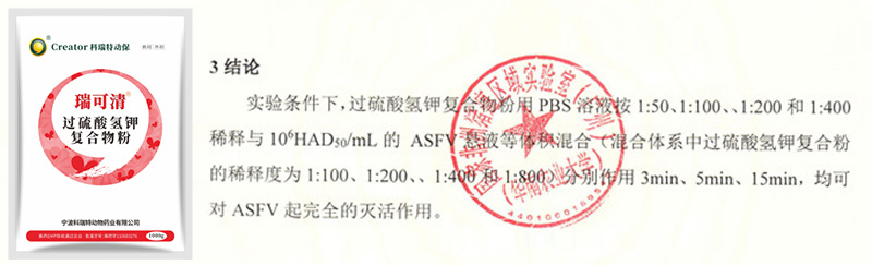 1、 生物安全措施之消毒:科瑞特的過硫酸氫鉀復合物粉“瑞可清“與戊二醛制劑”金戊迪“,均為對非洲豬瘟病毒有良好的殺滅效果。