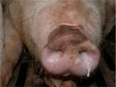 豬流感發(fā)病特征是突然發(fā)病,迅速傳播,很快漫延至全場(chǎng)。并以發(fā)熱、咳嗽、全身倦怠、鼻流大量清涕(后期轉(zhuǎn)為白色至鐵銹色濃涕,與繼發(fā)感染程度有關(guān))。