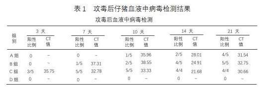 從試驗(yàn)結(jié)果可見:陰性對(duì)照組全程血清PRRSV CT值陰性,而陽性對(duì)照組每3天有3頭陽性,第7天全部轉(zhuǎn)為陽性,說明攻毒造模劑量是合適的。