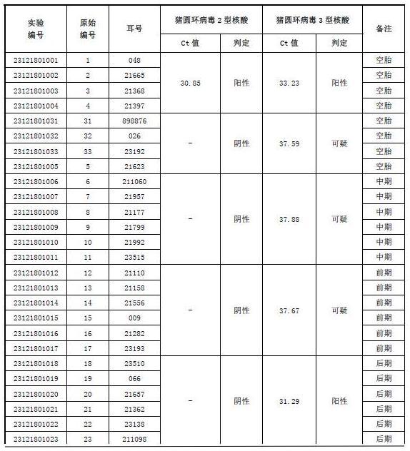 除了空胎有一組混合樣PCV-2抗原陽(yáng)性(C/T值為30.85),其它各混合樣均為陰性,說(shuō)明PCV-2也不是主要病因。