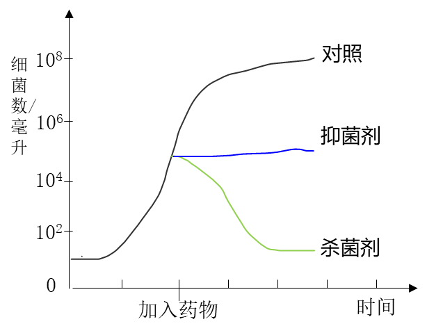 無論是殺菌劑還是抑菌劑,要想體現(xiàn)療效,還得有機體免疫力的參與,殺菌劑的劑量往往無法殺滅100%的病原微生物,抑菌劑則只是將病原微生物的數(shù)量控制在不增加,需要通過機體免疫系統(tǒng)清除剩余病原,疾病得以康復(fù)。如果沒有免疫系統(tǒng)參與,則一旦停藥,病原就會死灰復(fù)燃,再次猖獗。見圖。