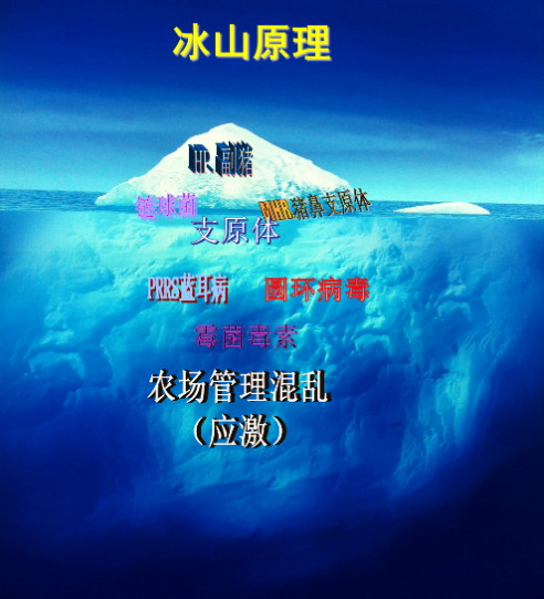 曾經(jīng)盛行的一種說法,叫冰山理論,用來闡述細(xì)菌病與以上三大因素的關(guān)系。即海面上看到的冰山,只有其真實大小的20%(實際上根據(jù)冰與水的密度計算,遠(yuǎn)不足20%),在海水的下面尚有80%。在豬病上的體現(xiàn)就是,你看到的副豬、鏈球菌、胸膜肺炎等細(xì)菌性病原,在疾病中重要性只占20%,發(fā)生這些疾病的根本原因(看不見的部分),其重要性占80%。而這80%,才是豬只健康管理的核心。